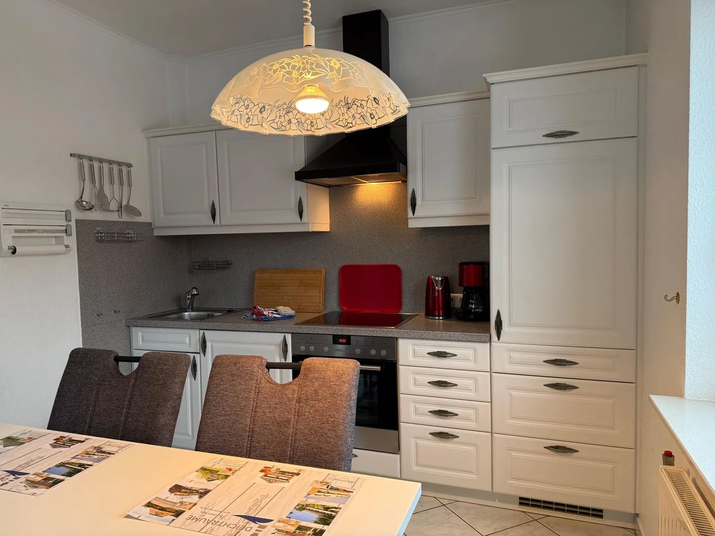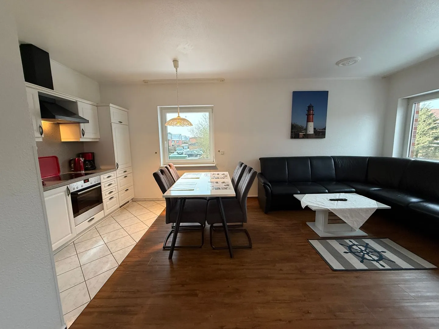 In der Küche gibt es eine gemütlich Sitzecke. Geschirrspüler und Backofen sind ebenfalls vorhanden.